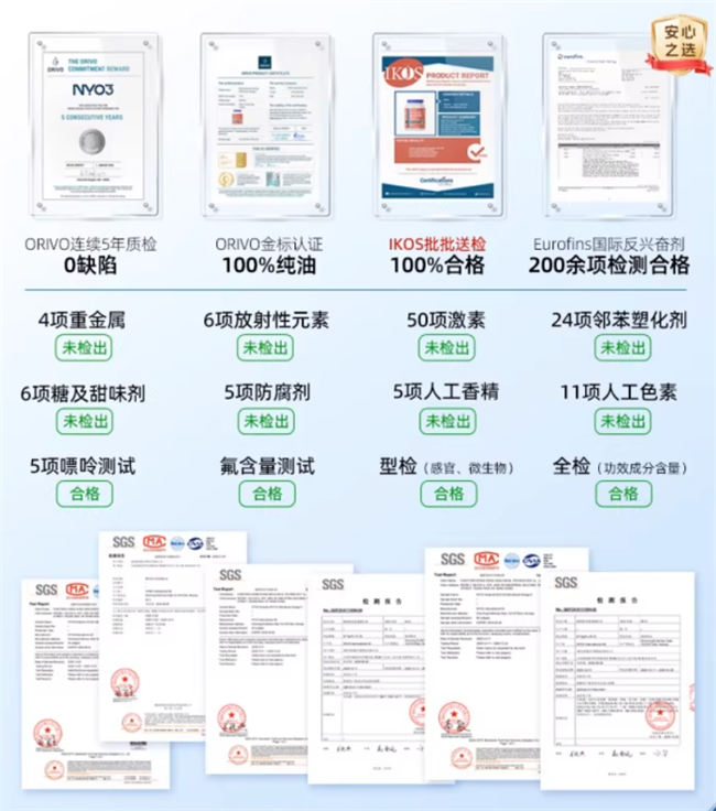 在安全层面,NYO3设立了远超行业惯例的苛刻防线。产品累计通过超过320项国际权威检测,构建了全方位的安全屏障。SGS检测报告证实,产品未检出24种邻苯二甲酸酯类塑化剂,且不含任何人工香精、色素、防腐剂及糖类添加,配料极致纯净。